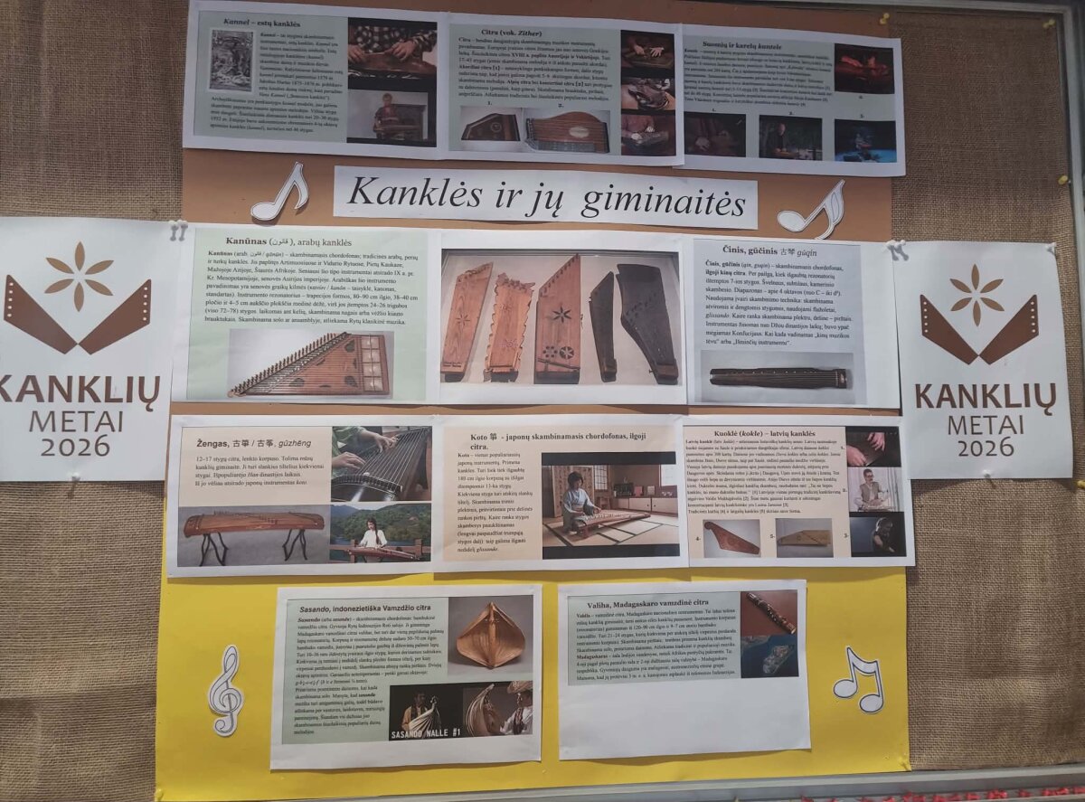 Mokykloje įrengtas stendas, skirtas Kanklių metams paminėti, kuriame kūrybiškai ir informatyviai pristatomi kanklių „giminaičiai“ – viso pasaulio styginiai instrumentai. Pateikiama informacija apie giminingus instrumentus – latvių koklę, estų kannelę, suomių kantele ir kitus styginius skambinamuosius instrumentus. Vaizdinė medžiaga (nuotraukos, schemos, trumpi aprašymai) padeda mokiniams aiškiau suprasti šių instrumentų panašumus ir skirtumus, jų sandarą bei skambėjimo ypatumus. Sausio mėnesį ,,Linksmosios polkutės 2026” konkurso metu buvo surengta vizuali paroda, kurioje demonstruojamos koncertinės ir autentiškos kanklės bei muzikinė literatūra kankliavimui. Mokiniai ir mokytojai turėjo galimybę iš arti apžiūrėti skirtingų tipų kankles, palyginti jų formą, dydį, stygų skaičių bei paskirtį. Eksponuojami natų leidiniai, metodinė medžiaga ir kūrinių rinkiniai atskleidė kankliavimo repertuaro įvairovę bei instrumento galimybes. Stendas ir paroda plečia mokinių informatyvumą bei žinomumą apie tautinį paveldą, skatina domėtis liaudies muzika, instrumentų istorija ir kultūriniu tapatumu. Tai ne tik informacinė, bet ir ugdomoji priemonė, kviečianti sustoti, paskaityti, palyginti ir atrasti.Tokiu būdu mokyklos bendruomenėje stiprinamas pagarbos jausmas tradicijoms, o Kanklių metai įprasminami gyvai, prasmingai ir kūrybiškai.