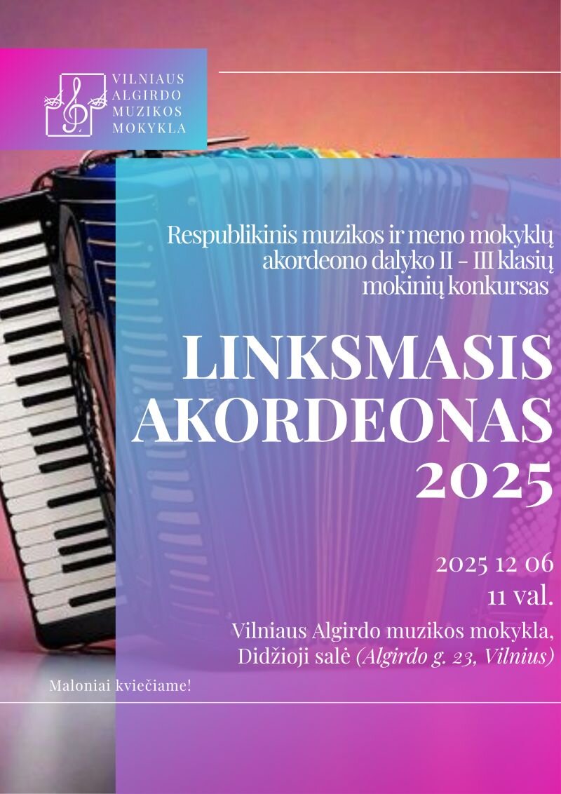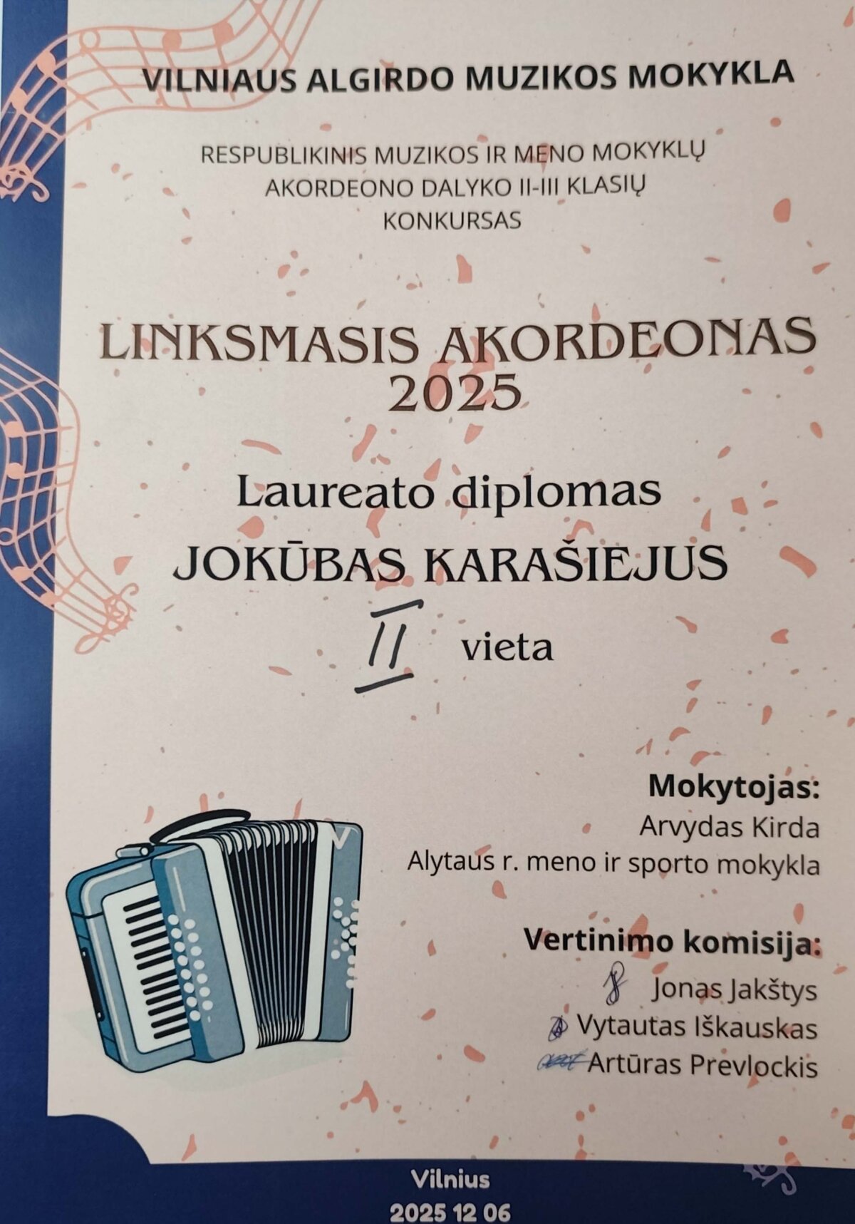 2025 m. gruodžio 6 d. Vilniaus Algirdo muzikos mokykloje vyko respublikinis akordeono dalyko II–III klasių mokinių konkursas „Linksmasis akordeonas 2025“, jame II-os vietos laureato diplomą pelnė jaunasis armonininkas Jokūbas Karašiejus (mokytojas Arvydas Kirda). Sveikiname!