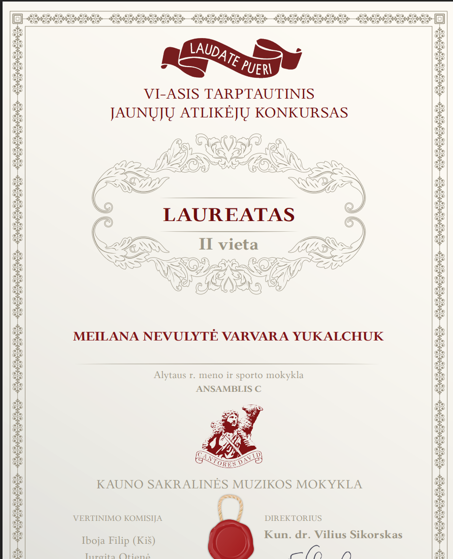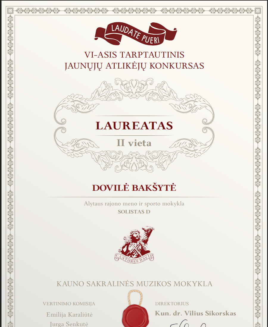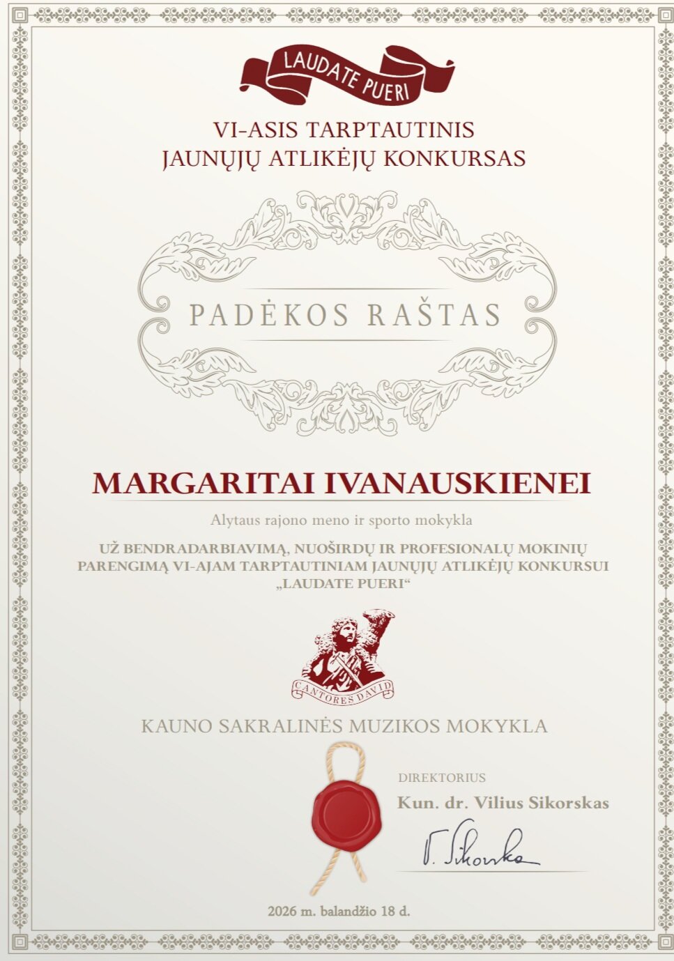 2026 m. balandžio 18 d., paskelbti nuotoliniu būdu vykę VI -ojo tarptautinio jaunųjų atlikėjų konkurso ,,Laudate pueri“ rezultatai, kurį organizavo Kauno sakralinė muzikos mokykla.Sveikiname Emilija Janulynaitę laimėjus I vietą ir Nominacija už sceninę kultūrą, mokytoja Margarita Ivanauskienė. Dovilė Bakšytė ir kamerinis kanklių ansamblis Meilana Nevulytė ir Varvara Yukalchuk pelnė II vietą konkurse, jų mokytoja Laimutė Aleksiupienė. Džiaugiamės kanklininkėmis tapus laureatėmis ir linkime sėkmės kituose konkursuose.