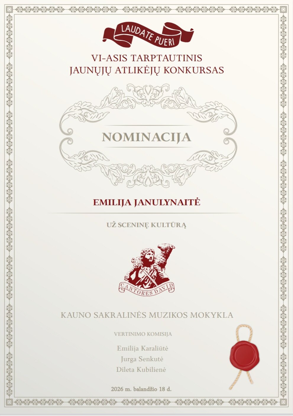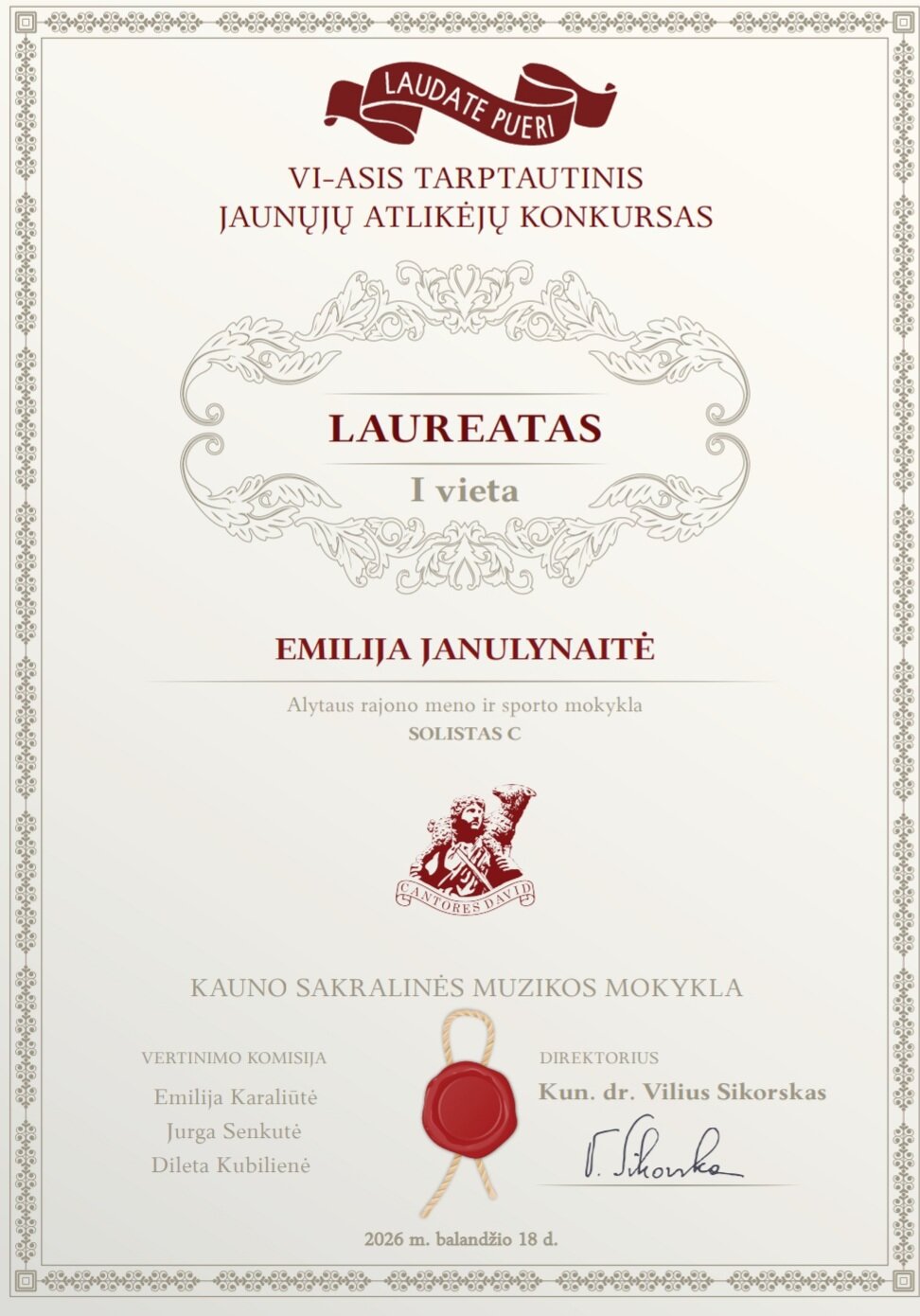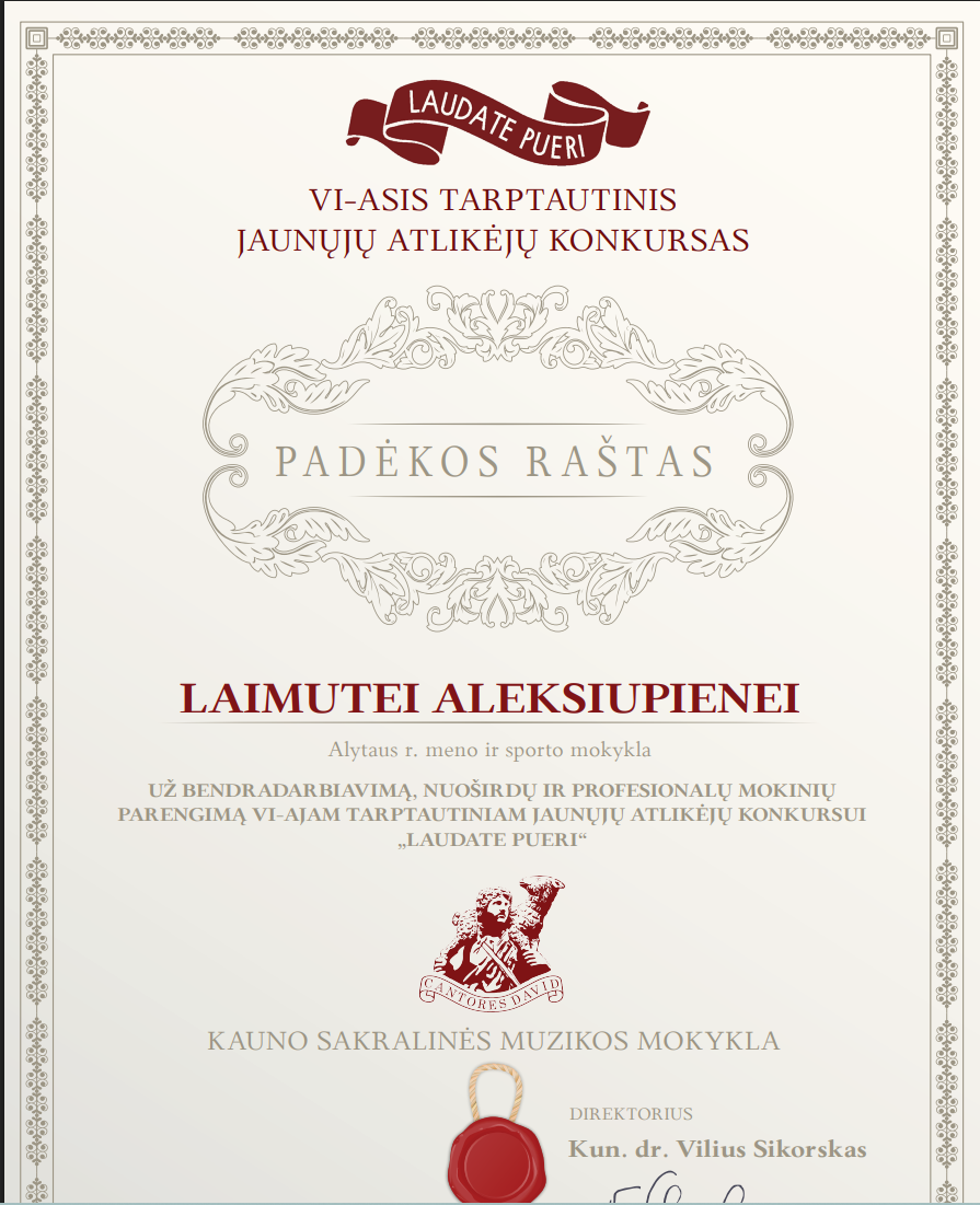 2026 m. balandžio 18 d., paskelbti nuotoliniu būdu vykę VI -ojo tarptautinio jaunųjų atlikėjų konkurso ,,Laudate pueri“ rezultatai, kurį organizavo Kauno sakralinė muzikos mokykla.Sveikiname Emilija Janulynaitę laimėjus I vietą ir Nominacija už sceninę kultūrą, mokytoja Margarita Ivanauskienė. Dovilė Bakšytė ir kamerinis kanklių ansamblis Meilana Nevulytė ir Varvara Yukalchuk pelnė II vietą konkurse, jų mokytoja Laimutė Aleksiupienė. Džiaugiamės kanklininkėmis tapus laureatėmis ir linkime sėkmės kituose konkursuose.
