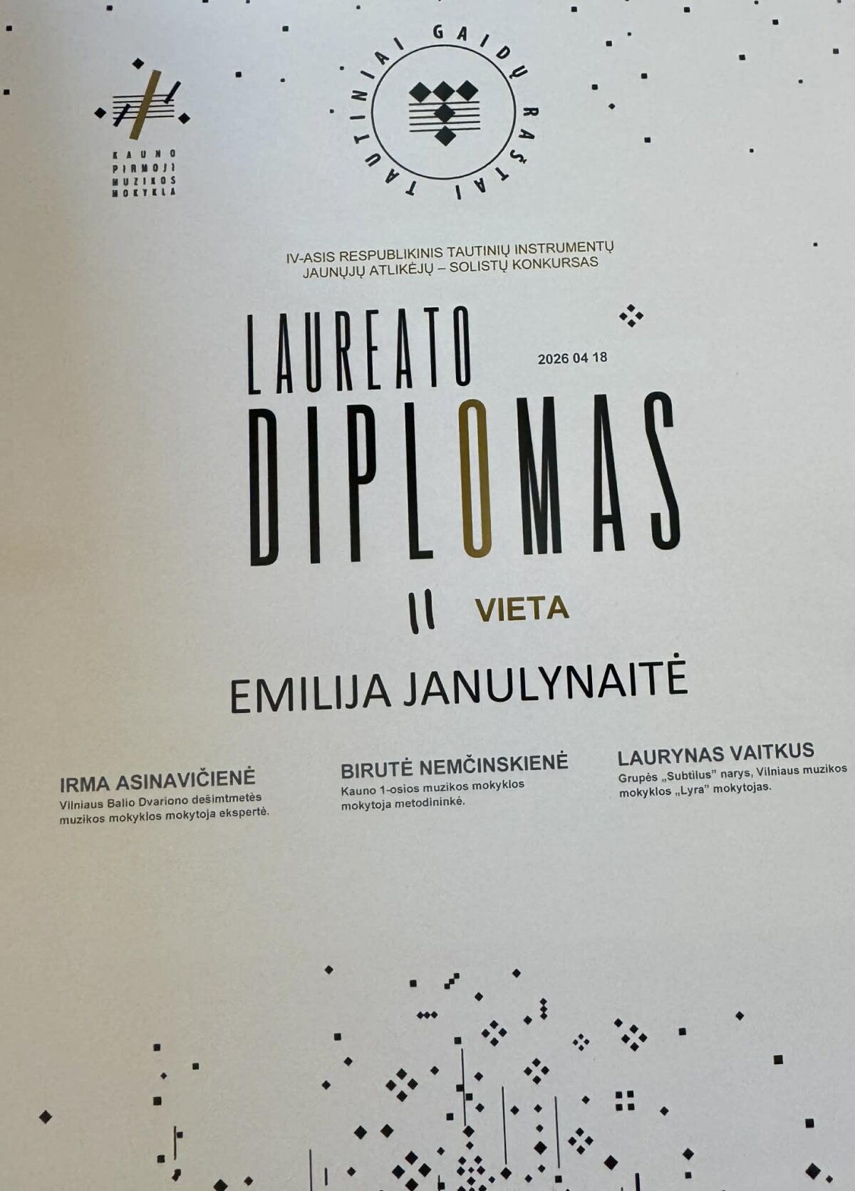 2026 m. balandžio 18 dieną Kauno pirmojoje muzikos mokykloje vyko IV-asis respublikinis tautinių instrumentų jaunųjų atlikėjų – solistų konkursas „Tautiniai gaidų raštai“, subūręs gausų būrį atlikėjų. Šiame konkurse Alytaus r. meno ir sporto mokyklai atstovavo talentinga mokinė Emilija Janulynaitė. Jos pasirodymas sulaukė puikaus komisijos įvertinimo – Emilija pelnė II vietos laureato vardą. Mokinę konkursui paruošė mokytoja Margarita Ivanauskienė. Dalyvavimas tokiuose konkursuose yra svarbi jaunųjų muzikantų ugdymo dalis – tai galimybė kaupti sceninę patirtį, tobulėti, bei pasisemti įkvėpimo klausantis kitų atlikėjų.