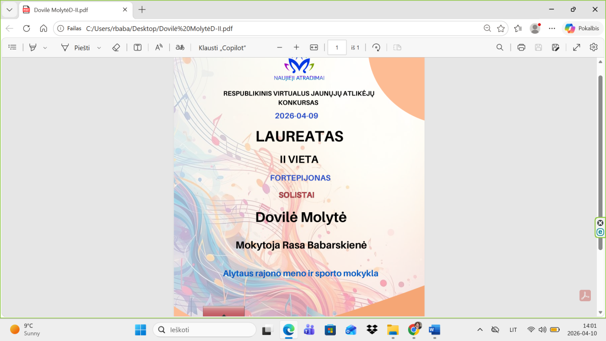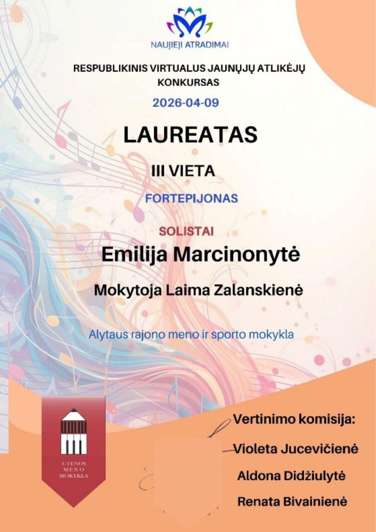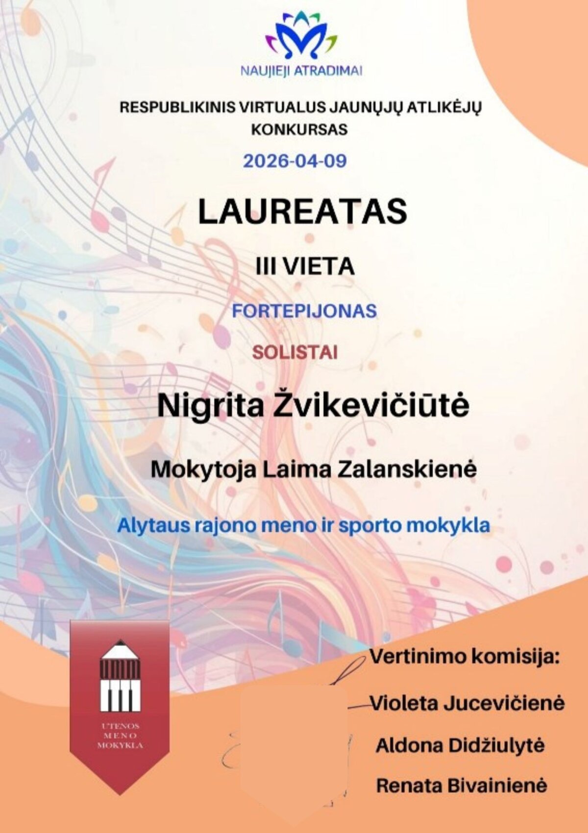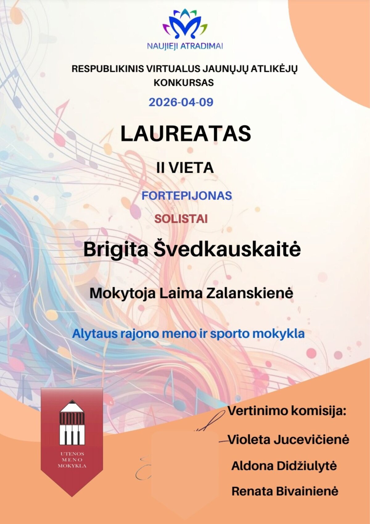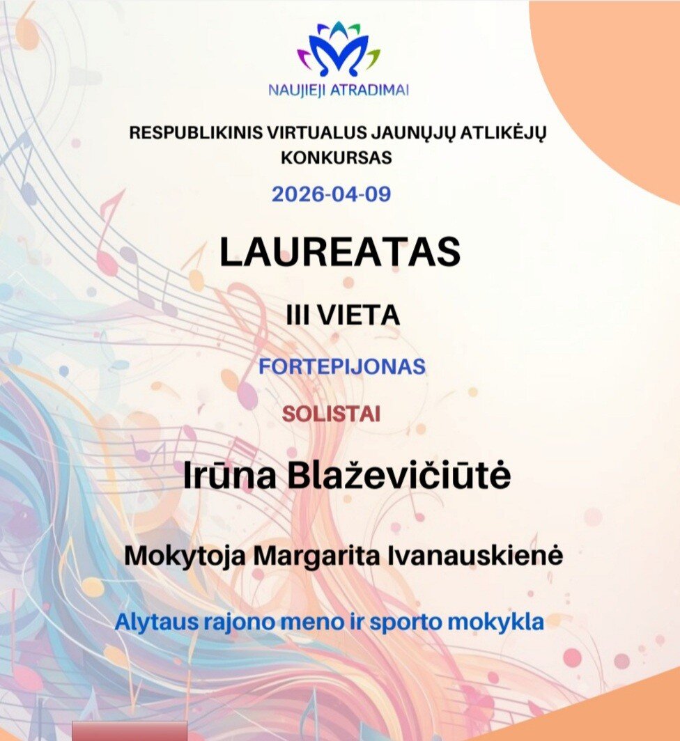 Sveikiname mokines ir jų mokytojas laimėjus respublikiniame virtualiame konkurse ,,Naujieji atradimai 2026“ prizines vietas. Fortepijono solistų kategorijoje, skirtingose dalyvių amžiaus (B, C) grupėse – II laureato vietas laimėjo Brigita Švedkauskaitė, Dovilė Molytė; III laureato vietas laimėjo Emilija Marcinonytė, Nigrita Žvikevičiūtė, Irūna Blaževičiūtė. Mokinių mokytojai - Laima Zalanskienė, Rasa Babarskienė, Margarita Ivanauskienė.