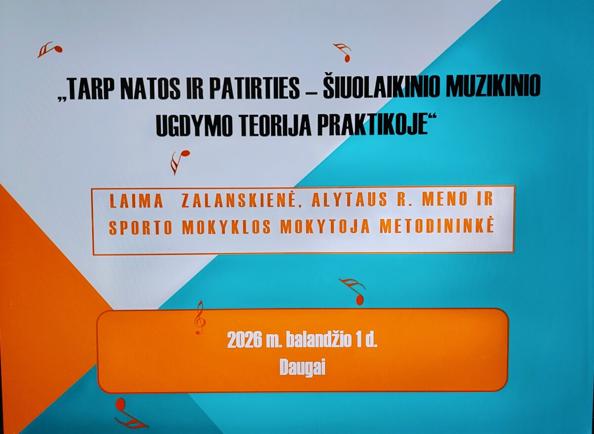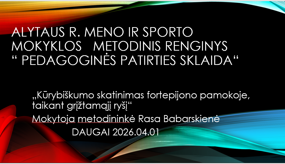 2026 m. balandžio 1 d. mokinių atostogų metu, Alytaus r. meno ir sporto mokykloje vyko metodinės tarybos renginys „Pedagoginės patirties sklaida“, subūręs mokytojus dalintis savo profesine patirtimi, idėjomis bei įžvalgomis. Renginio metu buvo pristatyti pranešimai, atspindintys pedagoginę veiklą, kūrybinius projektus ir ugdymo metodus. Mokytoja metodininkė Rasa Babarskienė pranešime „Kūrybiškumo skatinimas fortepijono pamokoje, taikant grįžtamąjį ryšį“ atskleidė savo taikomus mokymo metodus, dalijosi sėkmingomis praktikomis bei iššūkiais, su kuriais susiduria ugdymo procese. Pranešime ,,Tarp natos ir patirties – šiuolaikinio muzikinio ugdymo teorija praktikoje“, kurį skaitė mokytoja metodininkė Laima Zalanskienė buvo analizuojama šiuolaikinio muzikinio ugdymo teorijos ir praktikos santykis, akcentuojant mokinio muzikinės patirties reikšmę ugdymo procese. Teorinės įžvalgos buvo iliustruojamos praktikos pavyzdžiais iš fortepijono, solfedžio, choro pamokų. Renginio metu mokytojai taip pat apžvelgė savo per pastarąjį laikotarpį vykdytas veiklas, diskutavo apie pasiektus rezultatus bei galimybes tobulinti ugdymo procesą. Buvo aptarti ir suplanuoti artimiausio mėnesio darbai bei numatytos tolimesnės veiklos. Renginį organizavo metodinė taryba, siekdama skatinti pedagogų bendradarbiavimą, profesinį tobulėjimą ir gerosios patirties sklaidą.
